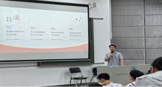 为引导大一新生树立正确的价值观与人生观,增强民族自豪感与社会责任感,10月14日晚,人工智能学院院长杨润丰在教三205教室,以“赓续抗战精神 青春挺膺担当”为主题,为2025级新生讲授了开学思政第一课。