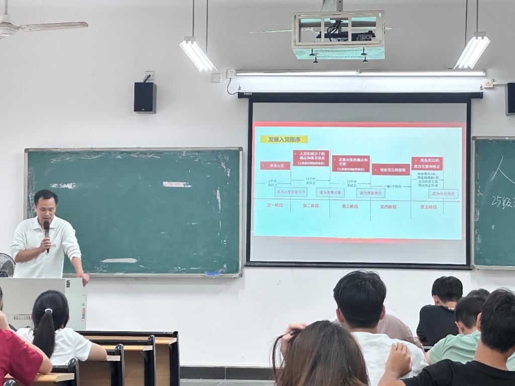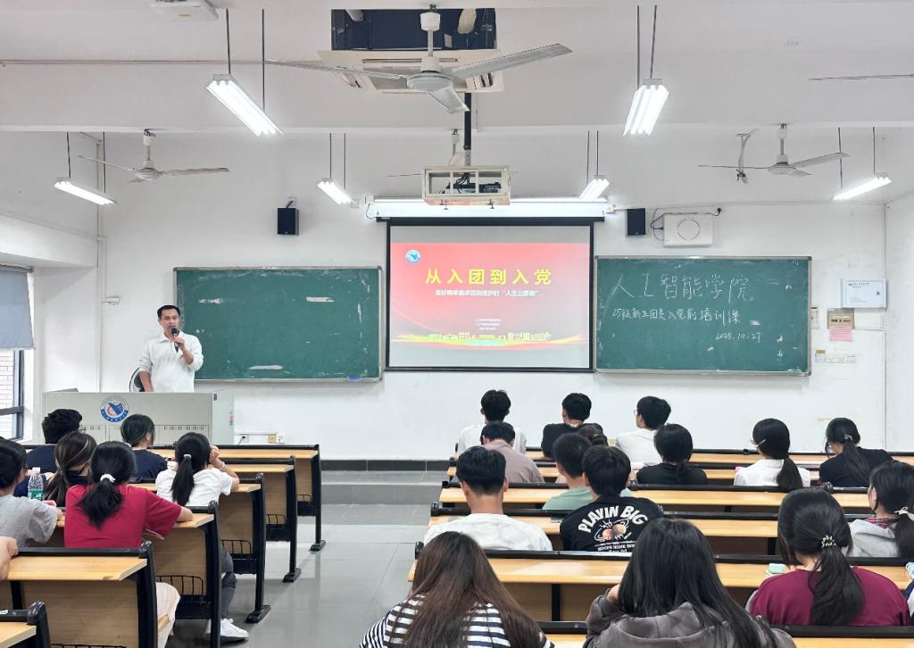 2025年10月27日,人工智能学院专职副书记吴戚武在教二(209)教室为80余名2025级新生团员点亮政治生命的第一盏航标灯。以“信仰引航·青春向党”为主线的入党前教育课,通过抗战精神与科技强国的时空对话,为青年学子刻下“跟党走”的信仰坐标。吴戚武副书记紧扣“两个先锋队”性质,透视党的性质宗旨与时代担当。结合习近平新时代中国特色社会主义思想,强调:“党不仅是工人阶级先锋队,更是中华民族伟大复兴的领航者!” “入党绝非功利选择,而是对‘我将无我’精神的价值认同!