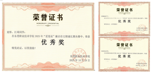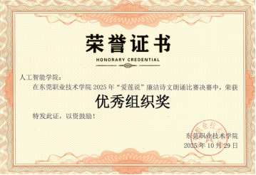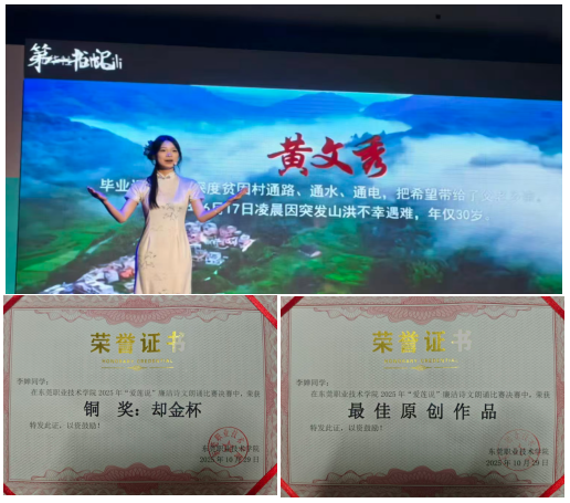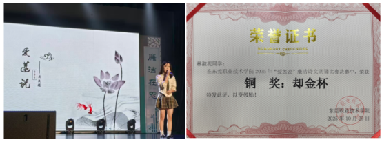 2025年10月29日,东莞职业技术学院第三届“清莲雅韵,廉润初心”《爱莲说》廉洁诗文朗诵决赛在修远楼梦想剧场圆满落幕。人工智能学院积极响应学校号召,精心组织,在比赛中表现优异,荣获“优秀组织奖”,参赛学子们更是斩获铜奖、最佳原创作品、优秀奖等多个奖项。