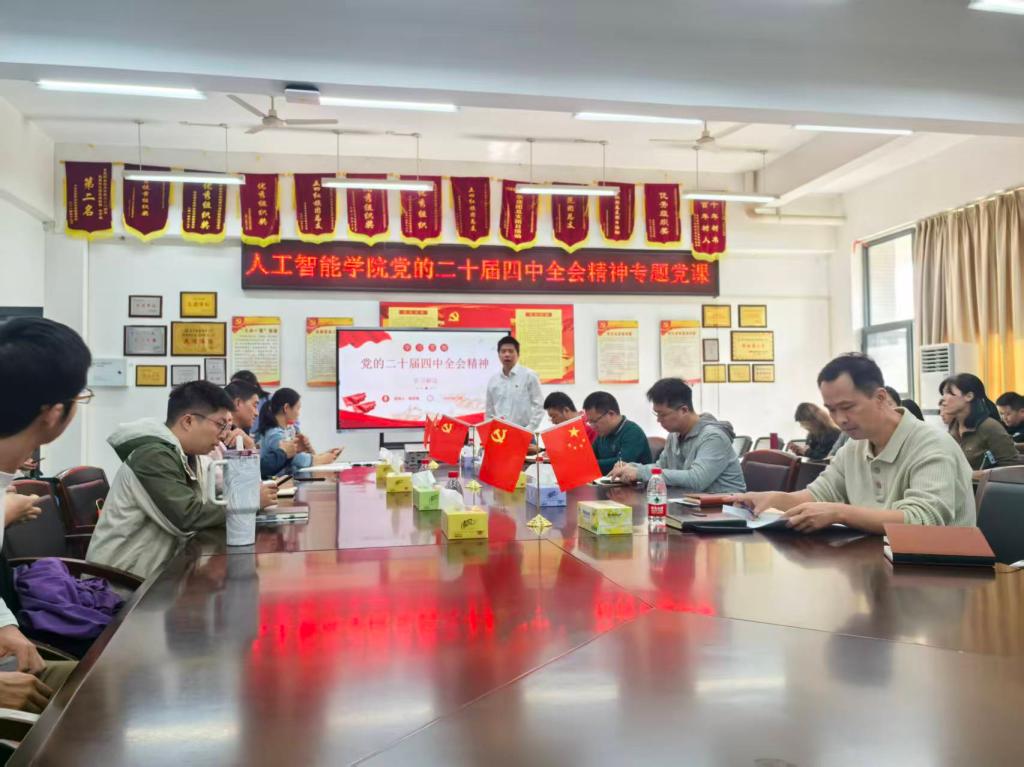 为深入学习贯彻党的二十届四中全会精神,推动全会精神在人工智能学院落地生根,2025年12 月 1 日下午 2 点,人工智能学院在 8A406 会议室开展党的二十届四中全会精神专题党课,学院党总支书记陈俞强担任主讲,学院全体教师、学生入党积极分子代表参与学习。