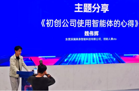 分享会上,深圳今日人才信息科技有限公司东莞区域负责人李颖聪以《AI数智员工赋能千行百业》为题,剖析智能体如何从对话工具演进为自主决策的数字劳动力,结合Gartner预测指出到2027年超半数企业将部署AI Agent,并展示其在制造、服务、政务等领域带来的效率革命。东莞城市学院图书馆馆长、信息中心主任陈显龙则从高校信息化建设视角出发,以《超级智能体驱动下的信息化建设范式变革与实践》为题,探讨超级智能体如何重构校园服务流程,推动数字化转型迈向更深层次。作为本次活动的亮点,东莞深澜具身智能科技有限公司创始人兼CTO、我校22级人工智能技术应用专业优秀学子魏伟辉,以《初创公司使用智能体的心得》为题,分享了自己从学生到创业者的实战经历,用接地气的开源技术落地案例,让在场同学直观感受到智能体技术在产业中的无限可能。