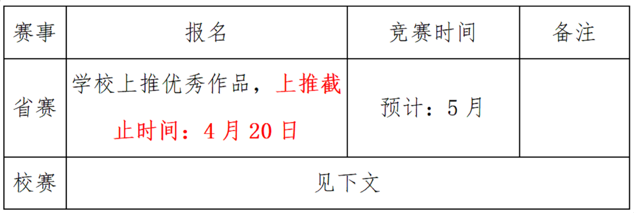 4月4日将导出竞赛作品,对超额作品组织评审,如所报作品为超额的类别,4月3日后提交的作品将不列入上推省赛的范畴,请注意时间节点。