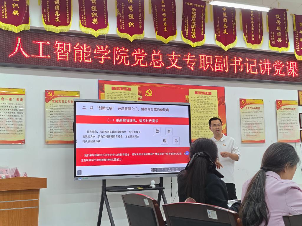 为深入贯彻落实党的教育方针,强化党员教师使命担当,10月22日下午,人工智能学院党总支专职副书记吴戚武以“铸魂育人,做新时代的‘大先生'”为主题,为学院全体党员教师讲授了一堂思想深刻、内涵丰富的专题党课。党课围绕“信仰之灯”、“创新之钥”、“笃行之功”三个维度展开,号召党员教师以德立身、以智启人、以行示范,争做新时代教育事业的排头兵。
